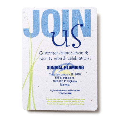 Impress guests with this eco-friendly seed paper invitation they can plant to grow a garden of wildflowers! Your full-color, custom message is printed directly on Premium seed paper with Earth-friendly inks that wont damage the seeds.Our seed paper is made by hand from 100%-recycled material and embedded with a hardy mixture of wildflower seeds. Just plant, water, and enjoy your wildflowers! Blank envelope included.